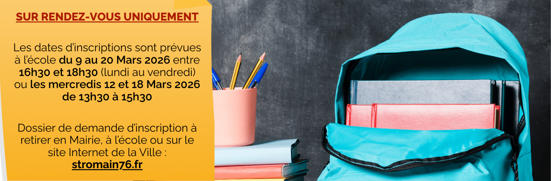 Rendez-vous à l'école du Lundi 9 au Vendredi 20 Mars 2026 aux horaires suivants : de 16h30 à 18h30 du Lundi au Vendredi ou les Mercredis 12 et 18 Mars de 13h30 à 15h30.