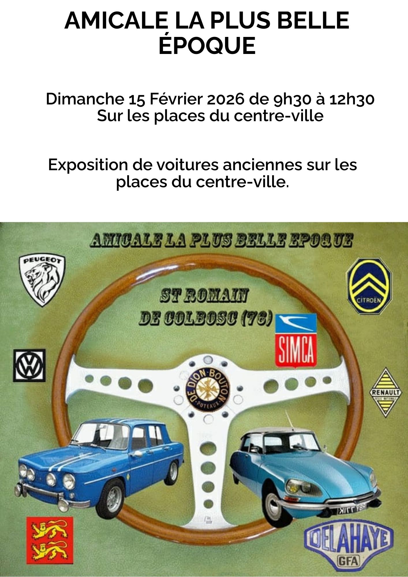 Du 15 Fév AMICALE LA PLUS BELLE ÉPOQUE L'association l'Amicale la Plus Belle Époque vous propose une exposition de voitures anciennes, le Dimanche 15 Février, de 9h à 12h30, sur les places du centre-ville. Timetable : 09h30 - 12h30 Adresse : Centre Ville Ajouter au calendrier Sur la cartoCentre Ville Fermer Precedent Retour à la liste Suivant