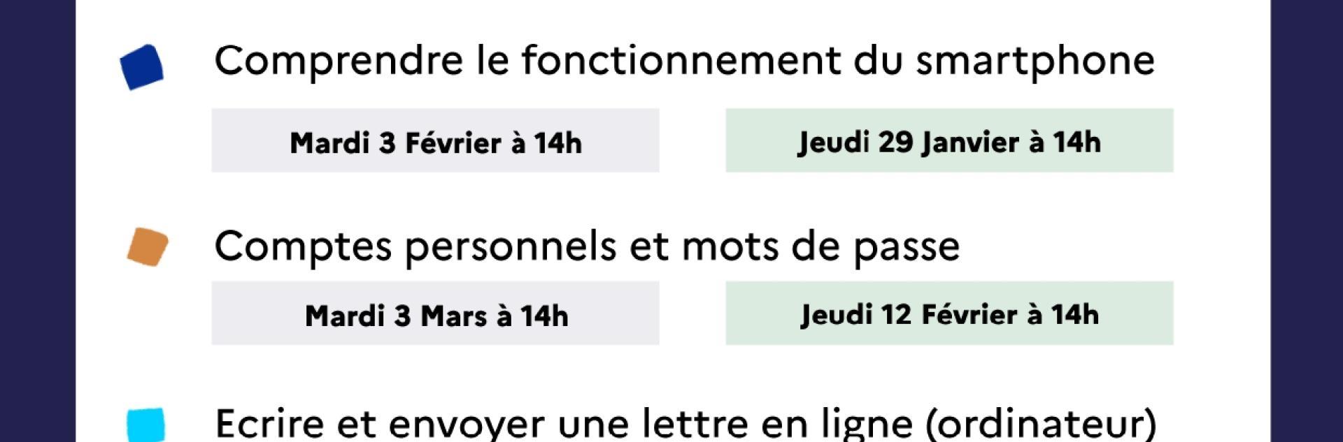 Du 03 Fév ATELIERS NUMÉRIQUES La Communauté Urbaine Le Havre Seine Métropole vous propose des ateliers numériques d'1h30 gratuits, sur inscription auprès de Pascaline COLLIN au 06 75 84 48 20. Maison du Territoire - 5 rue Sylvestre Dumesnil - 76430 Saint-Romain-de-Colbosc Timetable : 14h00 - 15h30 Adresse : Maison du Territoire Ajouter au calendrier Prochaines sessions : Comprendre le fonctionnement du smartphone Sur la cartoMaison du Territoire Fermer Precedent Retour à la liste Suivant