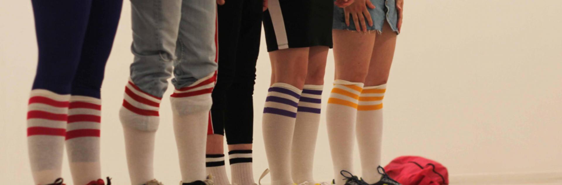 Face au public : des comédiennes, en ligne, au milieu d'un terrain de sport, ghetto-blaster en main, baskets bien lacées, regardent les gens droit dans les yeux pour leur dire "entre filles, il faut se serrer les coudes".