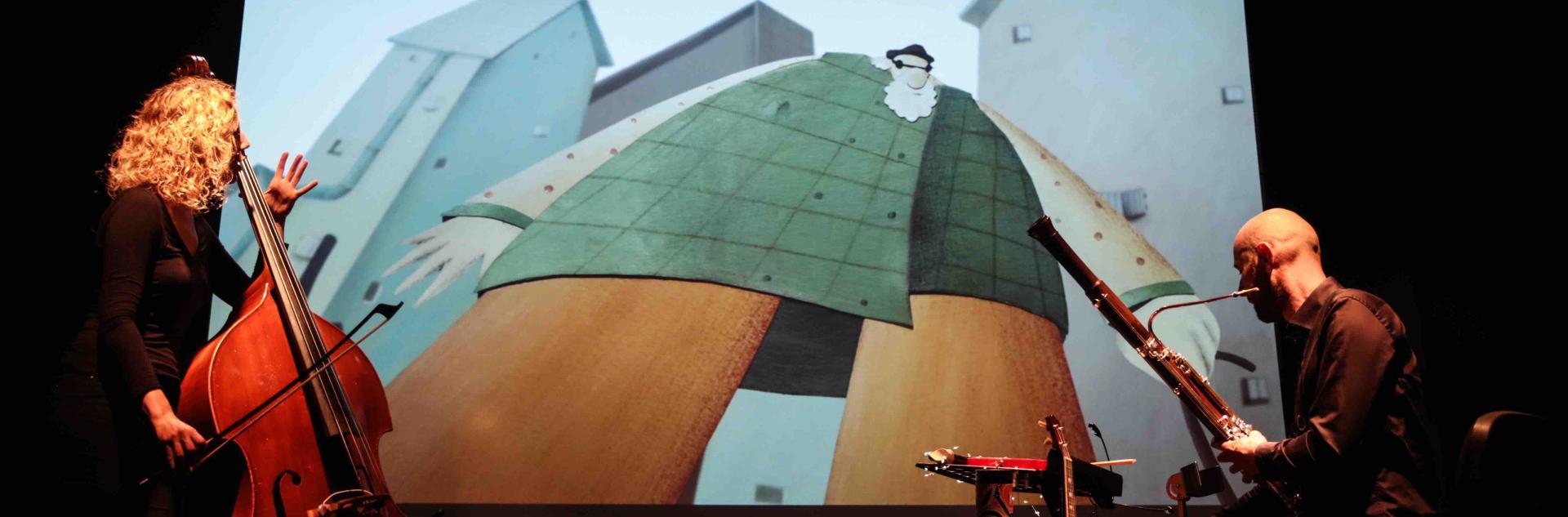 Clémence et Bruno travaillent le répertoire classique pour en faire une relecture unique dans l’exercice du ciné-concert. Timbre chaud du basson, contrebasse pincée ou frottée ouvrent les portes du possible, la rigueur du classique couplée à l’esprit improvisateur du jazz, prenant régulièrement les chemins de traverse des bruitages
